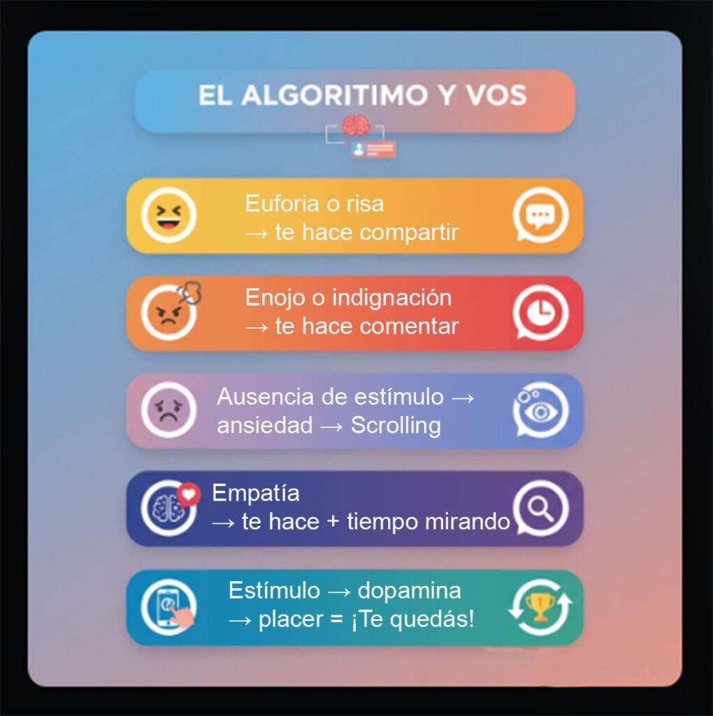 Ellas optimizan el algoritmo para que tengas una recompensa instantánea. Que caigas en un scroll infinito. Y así no te vas. Son las 12 de la noche y vos seguís pelotudeando con el celular. Y una de estas noches tendrás insomnio y te juro que prenderás el celular para quedarte una hora más gastando tu dedo índice.